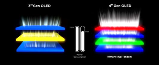 기존에는 '청색-황색-청색' 3층으로 백색광을 만든 반면 올해 선보인 4세대 패널서부터는 '청색-녹색-청색-적색' 4층 구조로 변화를 준 것이다.