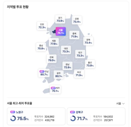 나머지 지역은 서울 74.1% 부산 71.9% 대구 73.3% 인천 72.3% 광주 80.1% 대전 73.3% 울산 73.8% 세종 77.6% 경기 73.9% 강원 73.4% 충북 71.9% 충남 70.8% 전북 79.0% 경북 73.4% 경남 72.6%로 기록됐다.