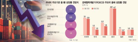 OECD는 3일(현지 시간) 발표한 ‘경제전망’ 보고서에서 올해 한국 경제가 1.0% 성장할 것으로 예상했다. 지난달 한국은행이 발표한 전망치(0.8%)보다는 높지만 OECD가 3월 제시한 중간전망치(1.5%)와 비교해서는 0.5%포인트나 낮아졌다. 내년 성장률 전망치는 2.2%로 3월 전망을 그대로 유지했다. OECD는 매년 2회(6월·12월) 세계 경제와 회원국, 주요 20개국을 대상으로 경제전망을 한다. 3월과 9월에는 중간 경제전망을 통해 전망치를 수정한다.