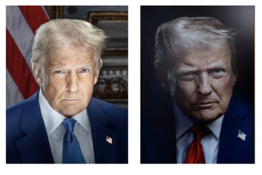 첫 공식 사진은 지난 1월 취임 직전 발표됐다. 첫 공식 사진은 트럼프 대통령이 지난 2023년 대선 결과 뒤집기를 모의한 혐의로 조지아주(州)에서 기소됐을 당시 촬영된 머그샷과 유사하다는 평가를 받았다. 배경으로 성조기가 보이고, 파란색 넥타이를 착용했다.
