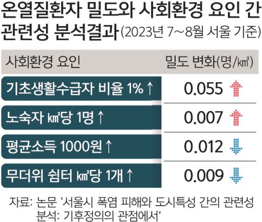 3일 국토지리학회지(제58권 4호)에 게재된 논문 ‘서울시 폭염 피해와 도시특성 간의 관련성 분석: 기후정의의 관점에서’(서정은·김흥순)에 따르면 2023년 7∼8월 서울시를 대상으로 행정동(426개)별로 소방재난본부의 온열질환 의심환자 출동 건수를 비교·분석한 결과 기초생활수급자 비율과 노숙자 밀도가 높을수록 온열질환자 밀도도 증가하는 것으로 나타났다. 구체적으로 기초생활수급자 비율이 1%, 노숙자 밀도가 ㎢당 1명 늘어날 때 온열질환자는 각각 ㎢당 0.055명, 0.007명씩 더 늘어나는 양상을 보였다. 연구진은 이를 두고 “경제적 취약계층과 주거 안정성이 낮은 취약계층이 폭염 피해에 더 큰 위험에 노출된다는 점을 보여준다”고 해석했다. 실제 기초생활수급자와 같은 경제적 취약계층은 에어컨 같은 냉방시설에 대한 접근성이 떨어지는 경향을 보인다. 노숙자의 경우 일정한 주거가 없는 만큼 폭염 피해에 직접 노출되는 경우가 많다.