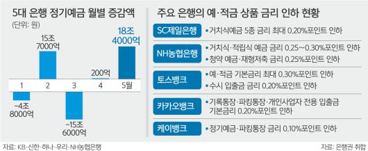 SC제일은행은 전날부터 거치식예금 5종 금리를 최대 0.20%포인트 내렸다. NH농협은행도 전날부터 거치식·적립식 예금 금리를 0.25∼0.30%포인트, 청약 예금과 재형저축 금리를 0.25%포인트 각각 인하했다.