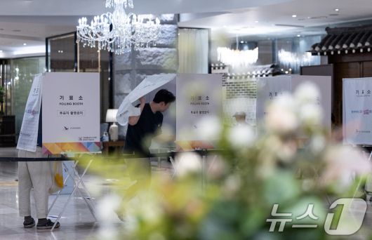 제21대 대통령 선거일인 3일 서울 구로구의 한 웨딩홀에 마련된 구로5동 제1투표소에서 유권자들이 투표하고 있다. 2025.6.3/뉴스1 ⓒ News1 이승배 기자 |