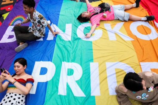 지난 1일(현지시간) 태국 방콕에서 열린 성소수자 행진에 참가한 사람들이 대형 무지개 깃발에서 포즈를 취하고 있다. 로이터 연합뉴스 |