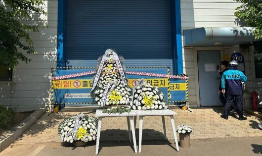 충남 태안 한국서부발전 태안화력발전소 한전케이피에스 종합정비동 앞에 지난 2일 작업중 숨진 하청노동자 김충현씨를 추모하는 조화가 놓여있다. 송인걸 기자 igsong@hani.co.kr |