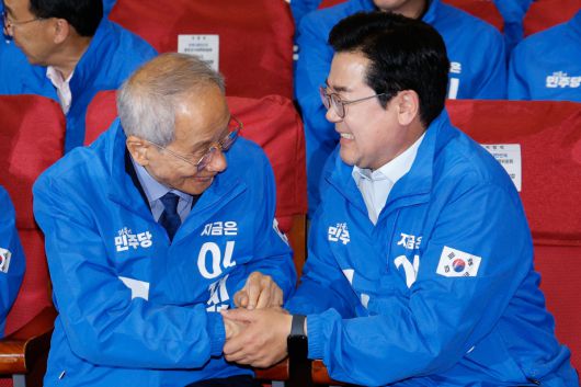 더불어민주당 박찬대(오른쪽), 윤여준 상임총괄선대위원장이 3일 국회의원회관 개표상황실에서 제21대 대통령선거 지상파 출구조사 결과에서 이재명 후보가 51.7%로 앞서는 것으로 발표되자 기뻐하고 있다. 연합뉴스 |