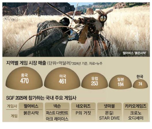 게임사 펄어비스는 연말 출시할 예정인 대작 게임 '붉은사막'을 들고 SGF 2025에 참여한다. 붉은사막은 광활한 대륙을 탐험하며 펼치는 전투를 담은 오픈월드 액션 게임으로, 7년여의 개발 기간을 거친 펄어비스의 차기작이다. 이전 게임쇼에서 펄어비스 자체 엔진으로 구현한 고품질의 그래픽과 영화 같은 연출과 더불어 정교한 전투 시스템이 해외 이용자들에게 호평받으면서 연말 출시에 이목이 쏠리고 있다. 펄어비스는 이번 SGF에서 그동안 선보이지 않았던 신규 콘텐츠를 소개할 예정이다.