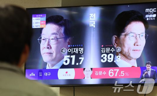 지상파 방송 3사(KBS·MBC·SBS)가 한국방송협회와 함께 실시한 21대 대통령 선거 출구조사에 따르면 △이재명 후보 51.7% △김문수 후보 39.3% △이준석 후보 7.7%로 예측됐다.