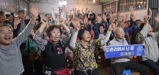 “우리 마실에 진짜 잔치도 이런 잔치도 없었지예.” 주민들은 경로당 안팎으로 자리를 펴고, 떡, 수육, 과일, 막걸리를 나눠 먹으며 잔치를 열었다. 주민 김순옥(63)씨는 “이재명 후보는 당당하고 아주 야무지다. 아무것도 바랄 게 없다”고 말했다.