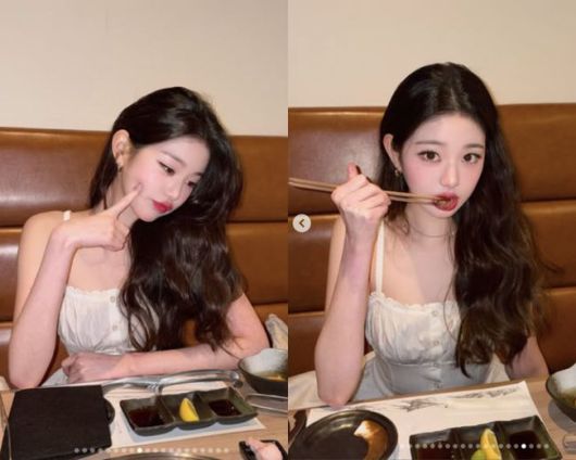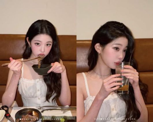 사진 속 장원영은 흰색 민소매를 입고 긴 생머리를 늘어트린 채 식사를 하고 있는 모습이 담겼다. 먹음직스럽게 고기를 먹는 가 하면, 음료수를 마시는 등 사진 한 장 한 장 마다 눈부신 인형 비주얼을 과시해 눈길을 사로잡았다.