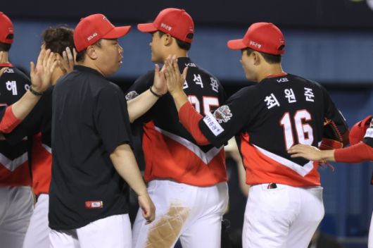 이범호 KIA 타이거즈 감독이 3일 서울 잠실야구장에서 열린 2025 KBO리그 정규시즌 두산 베어스와의 원정 경기에서 최원준과 하이파이브하고 있다. KIA 타이거즈 제공 |