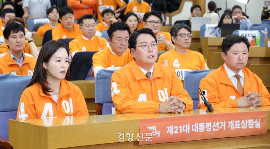 천하람 개혁신당 상임선대위원장이 3일 국회 의원회관에 마련된 제21대 대통령선거 개표상황실에서 심각한 표정으로 방송사 출구조사 결과를 지켜보고 있다. 성동훈 기자 |