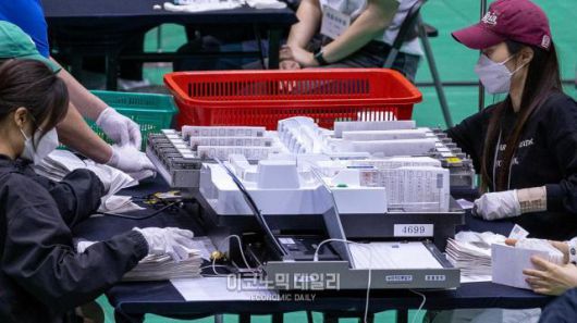 3일 오후 서울 관악구 신림동 서울대 체육관에 설치된 제21대 대선 관악구 개표소에서 개표사무원들이 분류기로 투표용지를 분류하고 있다. [사진=박명섭 기자] |