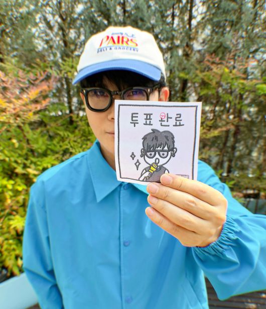 이승환은 지난달 29일 사전투표 당시 파란 셔츠에 파란 캡모자를 매치한 패션으로 '투표 인증샷'을 남겨 화제를 모았다.