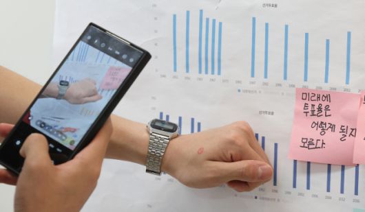 ▲제21대 대통령 선거일인 3일 대구 중구 동덕초등학교 1층 드라마실에 마련된 삼덕동 제2투표소에서 투표를 마친 유권자들이 투표소 밖 게시판에 붙어있는 초등학생들의 투표율 분석 게시물 앞에서 '투표 인증샷'을 남기고 있다. ⓒ연합뉴스 |