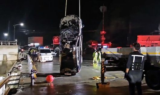목포해경이 2일 밤 전남 진도군 진도항 인근에서 일가족이 탄 채로 바다에 빠진 차량을 인양하고 있다. 광주북부경찰은 가족 3명을 숨지게 한 혐의로 40대 남성을 광주에서 붙잡아 조사 중이다. 목포해경 제공 |