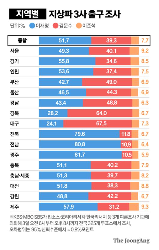 이외에도 광주(이재명 81.7%, 김문수 10.5%), 전남(이재명 80.8%, 김문수 10.9%), 전북(이재명 79.6%, 김문수 11.8%) 등 호남과 제주(이재명 57.9%, 김문수 31.2%)에서 이 후보의 압승이 예상됐고, 대구(김문수 67.5%, 이재명 24.1%)와 경북(김문수 64.0%, 이재명 28.2%)에선 김 후보가 체면 치레했다.