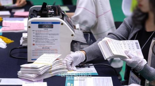 3일 오후 서울 관악구 신림동 서울대 체육관에 설치된 제21대 대선 관악구 개표소에서 개표사무원들이 분류가 완료된 투표용지를 계수하고 있다. [사진=박명섭 기자] |