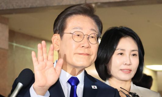제21대 대통령 선거에서 당선이 확실시되는 이재명 더불어민주당 대통령 후보(가운데)가 배우자인 김혜경씨(오른쪽)와 함께 2025년 6월3일 밤 11시46분께 인천 계양구 자택을 나서며 주민과 지지자들을 향해 인사하고 있다. 연합뉴스 |