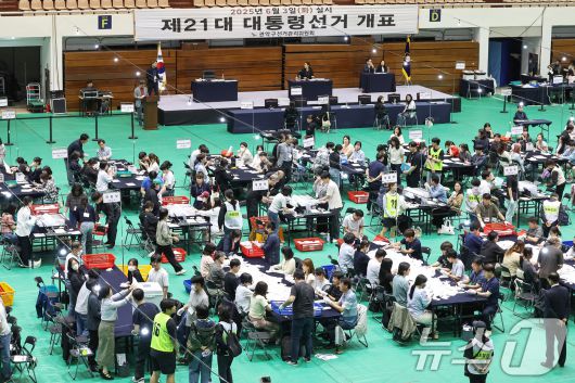 제21대 대통령 선거 투표일인 3일 오후 서울 관악구 서울대학교 체육관에 마련된 개표소에서 선거사무원들이 개표 작업을 실시하고 있다. 2025.6.3/뉴스1 ⓒ News1 민경석 기자 |