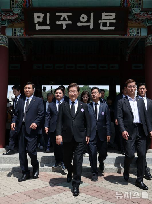 [광주=뉴시스] 조성우 기자 = 이재명 더불어민주당 대선후보가 18일 광주 북구 운정동 국립5·18민주묘지에서 열린 제45주년 5·18민주화운동 기념식에 참석한 후 이동하고 있다. 2025.05.18. xconfind@newsis.com |