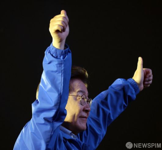 파란색 넥타이를 멘 정장 차림의 이 후보는 "아직도 개표가 진행중이어서 말씀드리긴 섣부르다. 만약 이대로 결과가 확정된다면 우리 국민 위대한 결정에 경의를 표한다"며 소감을 밝혔다.