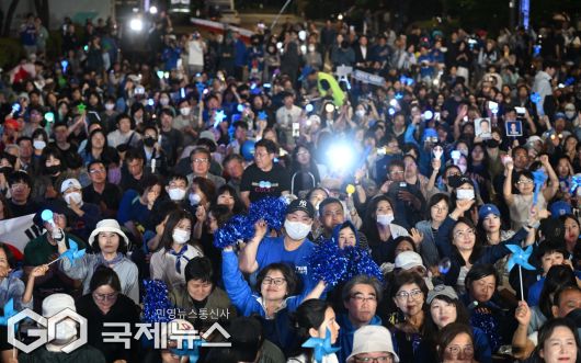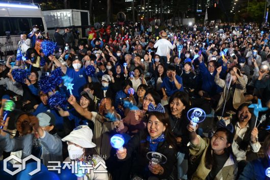 (서울=국제뉴스) 이재명 더불어민주당 대통령 후보가 3일 밤 당선이 확실시된 가운데 서울 여의도 국회 앞에서 지지자들이 환호하고 있다./사진=이용우 기자