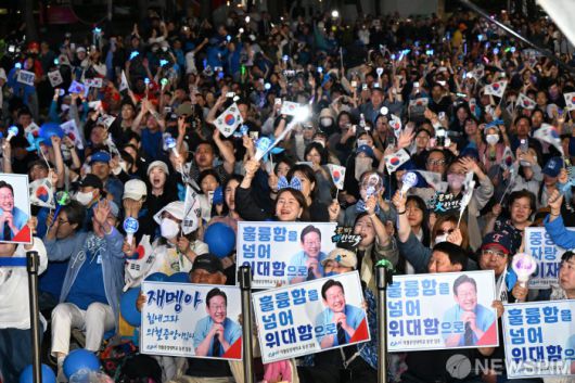 [서울=뉴스핌] 윤창빈 기자 = 3일 이재명 대통령 후보가 당선이 확정되자 서울 여의도 국회앞에 마련된 더불어민주당의 국민개표방송시청 현장에 지지자들이 환호하고 있다. 2025.06.03 pangbin@newspim.com |