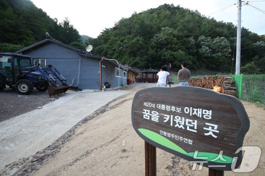 (안동=뉴스1) 공정식 기자 = 4일 이재명 더불어민주당 대통령 후보의 '당선 확실' 보도가 이어지는 가운데 이 후보가 월곡초등학교 삼계분교(당시 삼계국민학교)를 다니며 유년시절을 보낸 집과 고향 마을에 대한 관심도 높아지고 있다. 3일 오후 방송사 취재진이 경북 안동시 예안면 도촌리 이재명 후보의 집터를 취재하고 있다. 지난 대선 때 세워진 '제20대 대통령후보 이재명 꿈을 키웠던 곳'이라는 안내판이 보인다. 2025.6.4/뉴스1