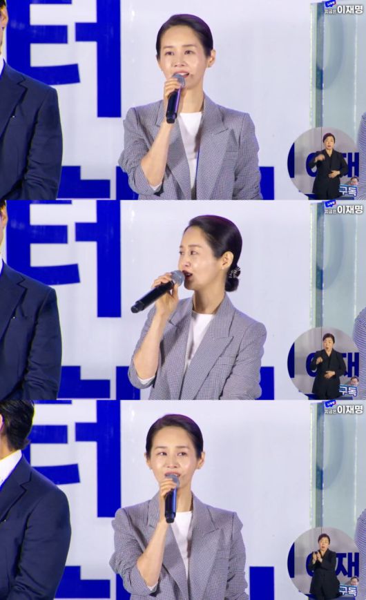 3일 오후 배우 김가연은 서울 여의도 국회의사당 앞에서 열린 민주당 개표방송 시청 행사에 출연해 이재명 지지 연설에 나섰다.