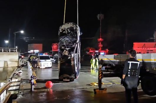 목포해경이 지난 2일 진도군 진도항에서 일가족 4명이 탑승했던 차량을 인양하고 있다. /뉴스1 |