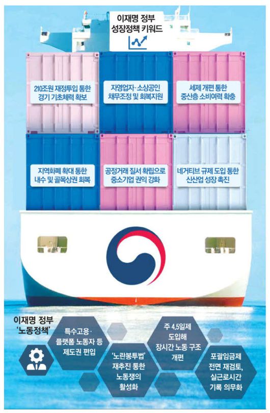 이재명 대통령 당선인의 경제정책은 성장과 분배 사이 효율적인 '줄타기'에 달려 있다. 실용주의를 전면에 내세운 이재명 당선인으로서는 고꾸라진 성장을 일으켜야 하는 동시에 진보진영 고유의 복지나 노동정책에도 소홀히 할 수 없기 때문이다. 이 당선인의 성장전략은 침체된 경기를 되살리기 위해 국가가 직접 역할을 수행하고, 대기업에 집중돼 있던 성장의 무게 중심이 지역과 중소기업·소상공인에 옮겨가도록 정부가 적극적인 행동에 나서는 것이다. 아울러 성장의 과실이 특정 집단에만 집중되지 않도록 노동자 권리를 제도적으로 보장하고 고용 취약계층에 대한 보호를 강화하는 방향으로 성장 기반을 넓힐 계획이다.