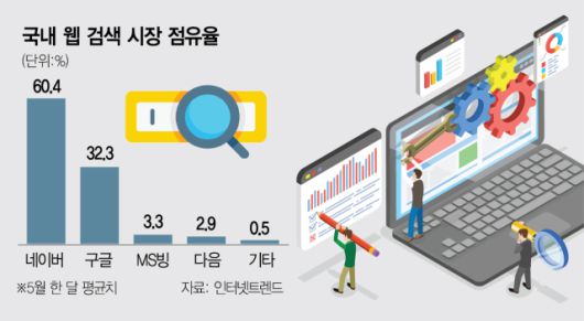 한때 ‘국민 포털’로 불렸던 다음과 네이트지만, 최근 네이버는 물론 구글·마이크로소프트(MS) 등 외산 검색 엔진에 밀리면서 토종 포털은 사라질 위기에 처했다. 실제로 인터넷트렌드에 따르면 5월 한 달동안 국내 웹 검색 시장에서 다음의 평균 점유율은 2.9%를 기록했다. 네이버(60.4%), 구글(32.3%), MS 빙(3.3%)에 밀려 4위다. 네이트는 독립 집계도 되지 않아 아예 기타(0.51%)로 기록됐다.