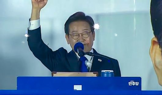 제21대 대통령 당선이 확실시되는 더불어민주당 이재명 대선 후보가 4일 서울 여의도 국회 앞 무대에서 지지자들에게 인사를 하고 있다. /사진=유튜브 |