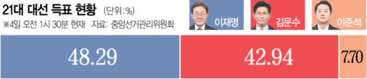 4일 중앙선거관리위원회에 따르면 대선 개표가 100% 완료된 결과 이 대통령은 최종 득표율 49.42%로 당선을 확정지었다. 김문수 국민의힘 후보는 41.15%, 이준석 개혁신당 후보는 8.34%를 각각 기록했다. 이 후보는 1728만7513표를 얻으며 김 후보(1439만5639표)를 8.27%포인트(289만1874표) 차로 앞섰다.