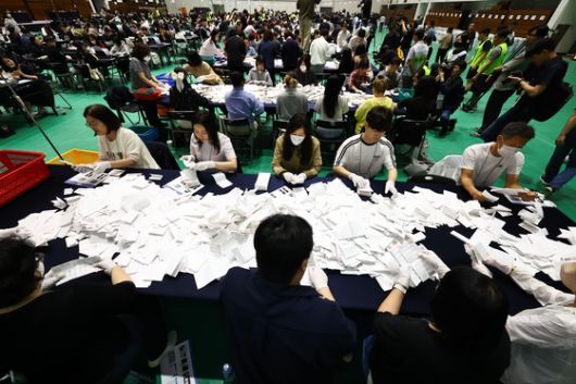제21대 대통령선거 투표일인 3일 오후 서울 관악구 서울대학교 체육관에 마련된 개표소에서 선거사무원들이 개표작업을 하고 있다. 김종호 기자 |