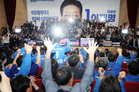 오후 8시, 이 대통령의 득표율이 50%를 넘고 김문수 국민의힘 후보를 10%포인트 이상 앞선다는 결과가 발표되자 일제히 환호성이 터져나왔다. 상황실은 “이재명”을 연호하는 목소리로 가득 찼고 당직자 대부분은 자리에서 일어나 박수를 쳤다. 일부 의원들은 흥분을 감추지 못하며 기립해 포옹했다. 이어진 지역별 출구조사 결과에서 이 대통령이 수도권에서 김 후보를 크게 앞서자 상황실은 다시 환호로 가득 찼다. 여의도 당사보다 넓은 회관 대회의실에 상황실을 마련한 것부터 이번 대선에 대한 민주당의 자신감이 반영됐다는 평가다. 박찬대 총괄선대위원장은 “국민의 절반 이상이 지지한 만큼 이재명 후보께서 그간 말한 대로 보복하지 않고 국민 통합을 이뤄 위기를 극복하는 길로 나아가는 데 크게 도움이 되지 않을까 생각한다”고 했다. 그러면서도 “대선 승리를 통해 내란의 실질적인 종식은 이뤄졌지만, 제도적 정비를 분명하게 하고 원인과 책임은 반드시 물어야 한다”고 말했다.