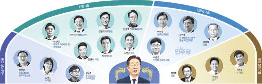 이 후보가 성남시장 때 만든 구청장 출신 모임 자치분권민주지도자회의(KDLC) 출신 이해식 비서실장, 김성환 정책부본부장과 경기도라인으로 분류되는 여론조사업체 리얼미터 조사분석실장 출신 권순정 전 당대표실 정무전략실장, 윤종군 의원, 안태준 의원 등은 여전히 이 당선인 곁에 머물며 이번 대선 선대위에서 조력자 역할을 톡톡히 했다.
