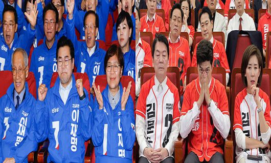 박수와 침울 사이 3일 이재명 대통령 당선인이 12.4%포인트 앞서는 제21대 대통령선거 방송3사 출구조사 결과가 발표되자 양당의 희비가 엇갈리고 있다. 더불어민주당 관계자들이 서울 여의도 국회의원회관 개표상황실에서 손뼉을 치고 있다(왼쪽 사진). 앞줄 왼쪽부터 윤여준·박찬대·정은경 선대위원장. 국민의힘의 관계자들은 여의도 국회도서관에 마련된 국민의힘 개표상황실에서 침울한 표정을 짓고 있다(오른쪽 사진). 앞줄 왼쪽부터 안철수·김용태·나경원 선대위원장. 허정호 선임기자, 이재문 기자 |