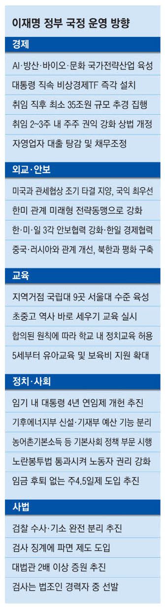 민주당에 우호적인 범여권 의석까지 합하면 189석에 이른다. 여기에 더해 3년 만에 행정권력까지 되찾으면서 이재명 정부는 경제·외교·안보·교육·사법 각 분야에서 전방위 개혁에 나설 것으로 보인다.