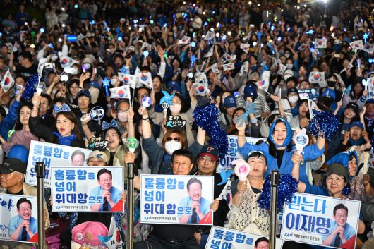환호하는 이재명 지지자들 3일 서울 여의도 국회 인근에서 더불어민주당 주최로 열린 제21대 대통령선거 국민개표방송 행사에 참석한 시민들이 방송 예측 시스템에서 이재명 대선 후보의 '당선 확실'이 나오자 환호하고 있다. 김호영 기자 |