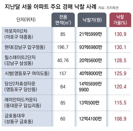 집값이 많이 오른 ‘강남3구’(강남·서초·송파구)의 낙찰가율은 특히 높았다. 강남구 압구정동 현대아파트 전용면적 196.7m²는 지난달 7일 경매에서 93억6980만 원에 새 주인을 찾았다. 감정가(72억 원)보다 21억 원 비싼 가격으로 낙찰가율은 130.1%였다. 지난달 12일 송파구 방이동 올림픽선수기자촌 전용면적 83m²는 감정가보다 18% 비싼 24억5888만 원에 낙찰됐다.