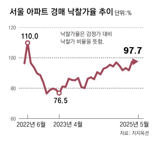3일 경·공매 데이터 기업 지지옥션에 따르면 지난달 서울 아파트 경매 진행 건수 252건 중 114건(45.2%)이 낙찰됐다. 낙찰가율은 97.7%로 2022년 6월(110.0%) 이후 2년 11개월 만에 가장 높았다. 2022년 12월 76.5%까지 떨어졌던 낙찰가율은 등락을 거듭하면서도 우상향 곡선을 그리다 100% 턱밑까지 올라섰다. 경매 시장의 핵심 지표인 낙찰가율이 오르면 그만큼 경매로 집을 사려는 수요가 늘고 있다는 뜻이다.