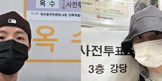 방탄소년단(BTS) 멤버 제이홉(왼쪽 사진)과 가수 아이유가 올린 대선 사전투표 인증 사진. 무채색 계열 옷을 입어 ‘색깔 논란’을 차단했다. 사진 출처 제이홉·아이유 소셜미디어 |
