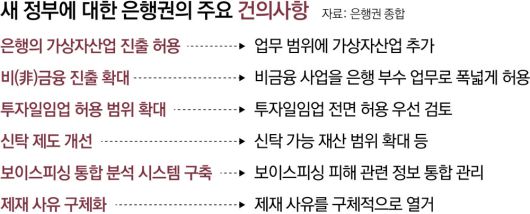 3일 금융권에 따르면 은행연합회는 시중·인터넷·특수은행 등 정사원(정회원) 은행 23곳의 의견을 수렴해 지난달 말 ‘은행권의 주요 건의사항’ 초안을 마련했다. 은행권에서 개선이 시급하다고 여겨지는 사항들을 새 정부에 공식적으로 건의하기 위해서다. 금융지주 고위 관계자는 “새 정부가 대통령직인수위원회 없이 출범하는 점을 고려해 은행권이 공통된 의견을 모아 전달하기로 한 것”이라고 했다.