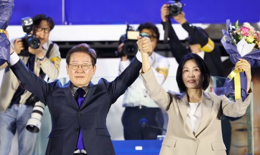 이재명 대통령 당선자와 김혜경 여사가 4일 오전 서울 여의도 국회 앞에서 열린 국민 개표방송 행사에서 꽃다발을 받은 뒤 시민들을 향해 인사하고 있다. 공동취재사진 |