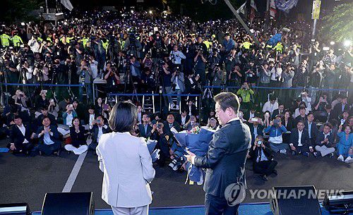 국민개표방송 행사장 찾은 이재명 후보 내외 |