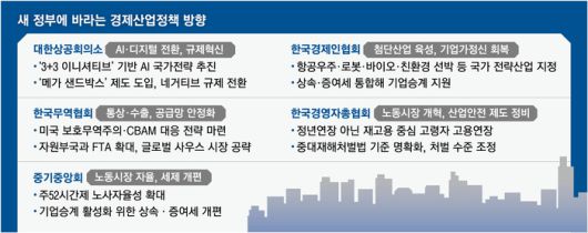재계 관계자는 “과거 정부 주도의 성장 공식은 더 이상 통하지 않는다”며 “새 정부에선 민간의 활력을 복원하고 새로운 성장 산업을 키워주는 전략이 절실하다”고 지적했다. 특히 “기업을 옥죄는 규제와 노동 시장의 경직성부터 혁신해야 한다”는 입장을 재확인했다.
