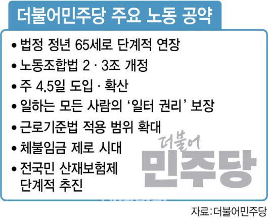 3일 노동계에 따르면 한국노동조합총연맹(한국노총)과 전국민주노동조합총연맹(민주노총)이 요구해온 노동 과제 가운데 이 후보 노동 공약에 담긴 과제는 법정 정년 연장, 주 4.5일 근무제, 노동조합법 2·3조 개정(노란봉투법), 5인 미만 사업장에 근로기준법 적용 확대가 대표적으로 꼽힌다.