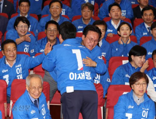 박찬대(가운데 뒷모습) 더불어민주당 상임총괄선대위원장과 김민석 상임공동선대위원장이 3일 국회 의원회관에 마련된 개표 상황실에서 이재명 후보의 당선 유력 예측이 담긴 방송사 출구조사 결과 발표를 들은 뒤 포옹하며 기뻐하고 있다. 홍윤기 기자 |